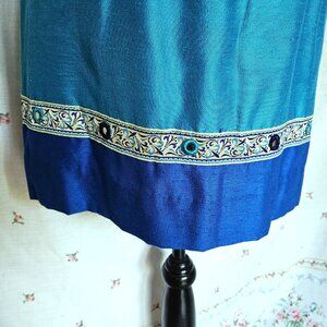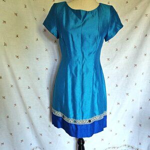 Vintage above knee length dress, probably early 2000s. Turquoise blue slubbed fabric with royal blue at hem, ribbon trim and mirror appliques. Short sleeves, back zipper.