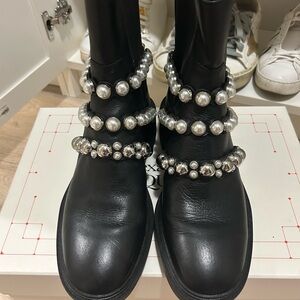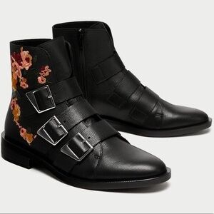 Size 7.5 (38) Zara Women’s Trafaluc Floral Embroidered Buckle Ankle Boots Black