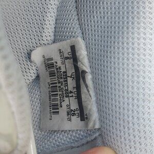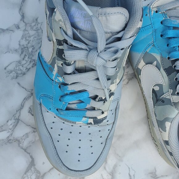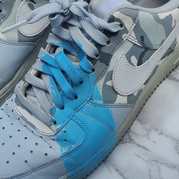 The product is a Nike Air Force 1 Low Camo Custom sneaker in size 8, featuring a camouflage pattern hand-painted blue stripe on white leather uppers. This limited edition shoe is signed by the artist and released in 2018. With a low top design and lace-up closure, it is perfect for casual or activewear occasions in any season. As part of the Nike Air Force product line, this athletic shoe combines style and comfort for men looking for a unique and personalized addition to their collection.