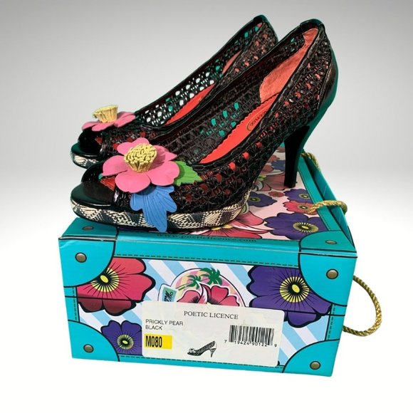 Cute rattan upper with leatherette floral applique, 1/2 inch platform and 3 inch heel. Shoes only worn once and come in original packaging.