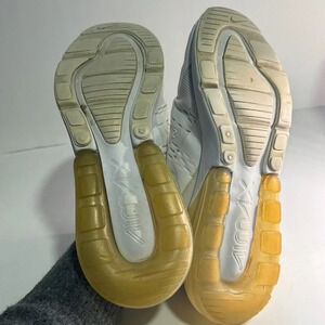 some wear on these but still in great shape. See photosElevate your sneaker game with these stylish Nike Air Max 270 sneakers in size 8.5 for women. Featuring a low top design in a sleek white colour with light bone, sail, coconut milk, and sesame accents, these athletic shoes are perfect for walking or everyday wear. The lace-up closure, cushioned sole, and breathable synthetic upper provide comfort and support, making them a must-have addition to your shoe collection.