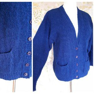 Vintage 1980s V neck cardigan sweater in a navy blue textured acrylic. Front buttons, patch pockets.