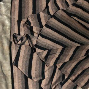 I love love love the way this top hangs!! It is a longer style (not quite a tunic). The neckline is in a contrasting stripe, and the low v neck is amazing on. The ruffles are sewn into a v at the bottom so are attached. This keeps them from getting in your way. The back is plain making this a blazer friendly top, Surprisingly nice top from an unexpected source.
