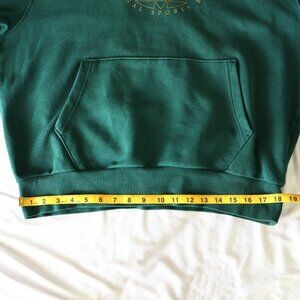 Adidas hoodie in green. The adidas on the sleeve is stitched in gold, Men's Medium (unisex). The drawcords are frayed.