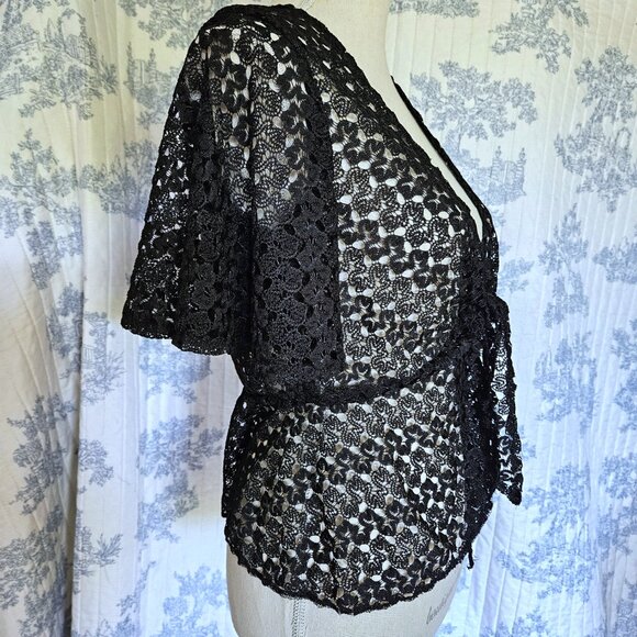 Unlined cropped cardigan with flutter sleeves, peplum and front ties. Made from soft black lace fabric.
