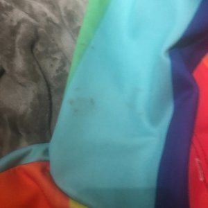 This is a light material, more for show then warmth! COlors are very bright, Slight stain on the hood. Elastic cuffs and a kangaroo pocket
