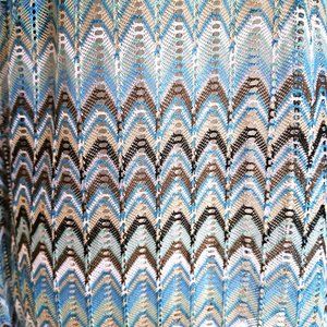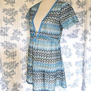 Vintage 1990s short sleeve tunic length blouse in a sheer lace fabric with bargello design in blue, brown, tan, white. Elastic around waist, deep V front with metal ring.