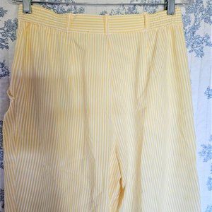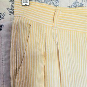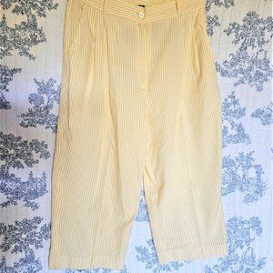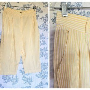 Vintage 1990s capri pants in a white and yellow seersucker fabric. High rise, pockets, front fly, elastic at sides of waistband.
