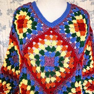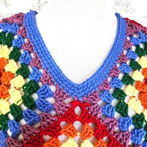 New Hand crocheted pullover poncho. Made up of granny squares crocheted in rainbow coloured acrylic yarn.