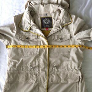 Vince Camuto Oyster Cinched Waist Anorak Hidden Hood Jacket. With green/yellow trim. The hood can be rolled up in the collar.