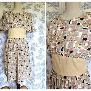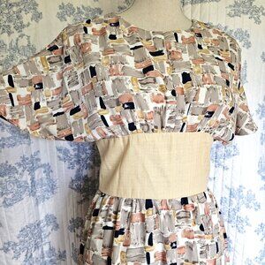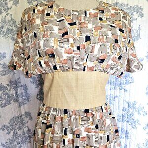 Dress in beige, pink, navy polyester fabric with beige band around waist, flutter sleeves, back zipper. About knee length.