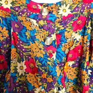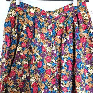 Vintage 1990s skirt, below knee to midi length. fabric is a bright floral cotton. Pleated to waistband, has side pockets, buttons down front.
