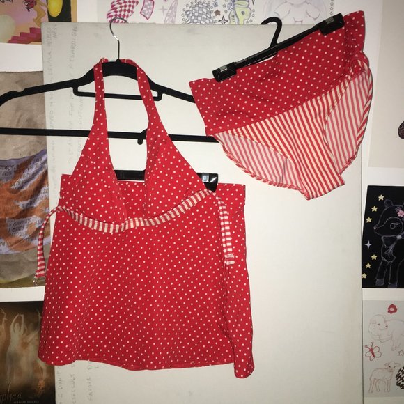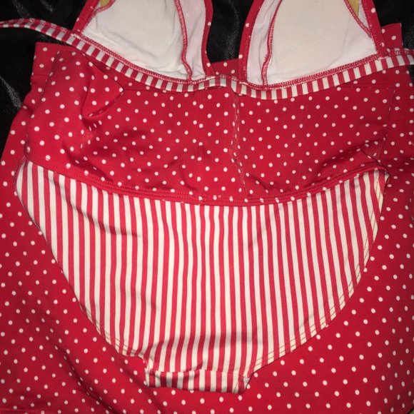 Red and white lined and polka dot designs, has a pin-up girl vibe. Side slits polka dot skirt that has a slimming effect