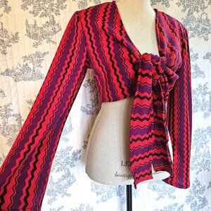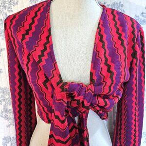 Retro style tie front cropped top or light cardigan. Made from a medium weight vintage knit fabric with a zigzag pattern in red, purple and black, has stretch. Unlined, long slightly flared sleeves, ties in front.