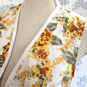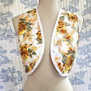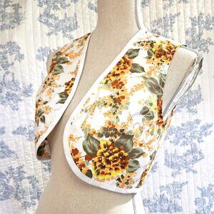 Cropped unlined vest in vintage fabric, white, orange, yellow, green floral cotton. White edging.