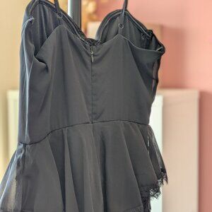 Selling a lovely black dress with a tiered ruffle design. It's in great condition and would be perfect for a night out or a special occasion! The dress features delicate lace detailing on each tier, adding a touch of elegance.