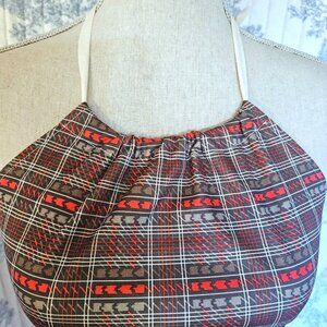 Retro style Halter top in a dark orange and olive green polyester/spandex blend vintage fabric. Stretches to fit, cotton twill tape adjustable tie, ties at back neck.