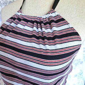 Retro style Halter top in a red, blue, black striped cotton/spandex blend vintage fabric. Stretches to fit, black tape adjustable tie, ties at back neck.