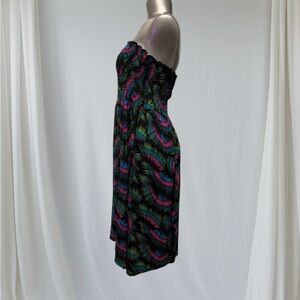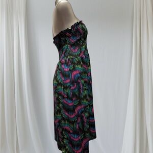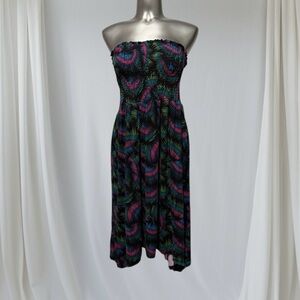This strapless sundress showcases an elasticized bodice and a flowing skirt, perfect for casual or resort wear. The vibrant purple and pink hues create a lively and eye-catching look, ideal for sunny days. Its cool rayon lightweight stretch fabric ensures comfort and style in warm weather. Rayon/Elastane/Spandex fabric.