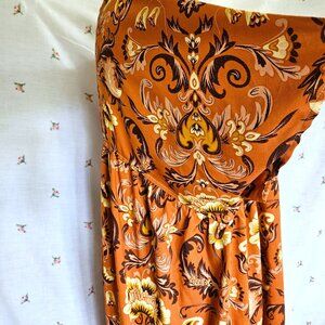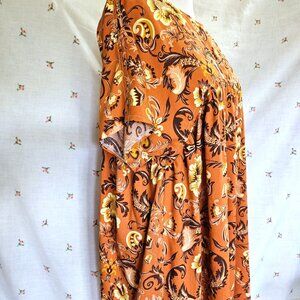 Midi length loose fitting pullover dress in a rayon fabric with burnt orange background. Short kimono style sleeves, gathered to yoke at bustline.