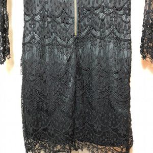 This asymmetrical black dress fits above the knee and features tight lace sleeves. The overall fit is body confident.