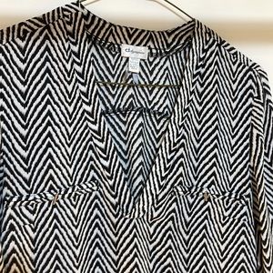 Ladies, black and white blouse, cute little metal pen, kind of buttons V-neck longer at the back and the front beautiful blouse very elegant effortless