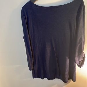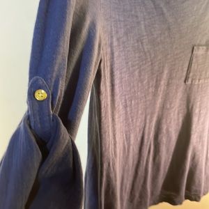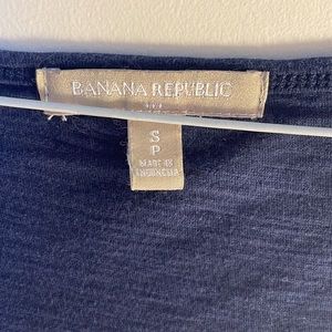 Banana republic, size small, navy T-shirt, hundred percent cotton loose, wide, neckline little sleeves with gold buttons choose to open or button up size medium high measurements pita pit 18 inches length 26 inches