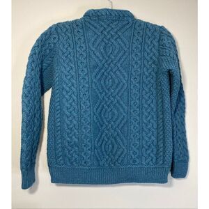 Size small, Aran Mõr Irish teal sweater in 100% merino wool. Made in Ireland.