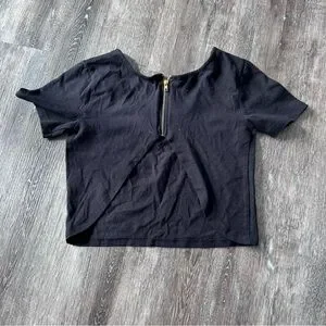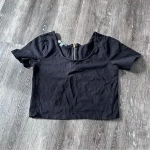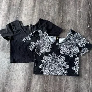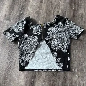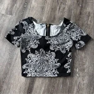 Fresh black crop top with a bold white paisley print. Lightweight and breathable for everyday wear. Short sleeves and a modern cropped silhouette. Easy to pair with high-waist bottoms for a polished look.