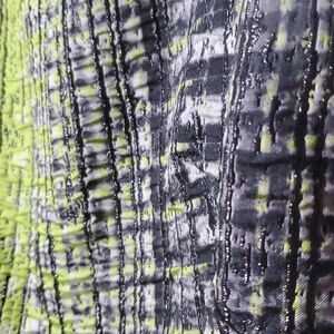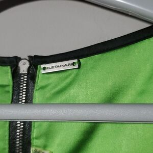 Straight style, 60s inspired. Falls slightly above knee. Metalic black threading scattered throughout the dress enhances the lime green and gray geometric pattern.