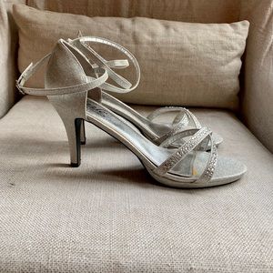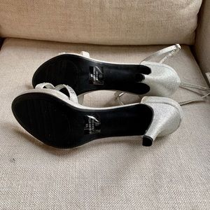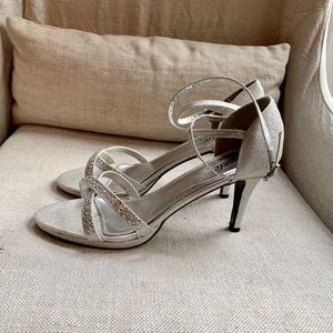 Gorgeous silver heels that sparkle all over! Criss cross ankle straps with silver hardware. Great for a night out on the town! Have only been worn once (inside) on a cruise, but unfortunately the glue on the footbed has started to yellow over time (please see photos). This does not affect their beauty once they are on your feet! 2.5 in. heels.
