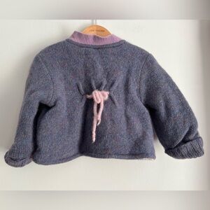 The most adorable cardigan sweater. I believe the brand tag says Skazandi. Beautiful purple colours throughout with the sweetest dog and hearts with accent faux buttons. There are snaps for closure and a cute little accent tie in the back. It is lined with very cozy (not itchy!) fabric. No materials tag, but my best guess is wool or acrylic. The design is definitely created by some needle point fibre felting - this is a true work of art! Thick enough you could wear this as a jacket on cooler days/nights.