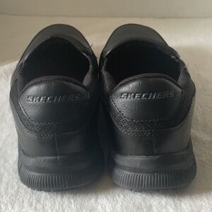 Experience effortless style with these Skechers black loafers, featuring a sleek slip-on design and elastic side panels for easy wear. The minimalist look is complemented by a smooth leather-like upper and a comfortable black rubber sole, making them perfect for both work and casual occasions.