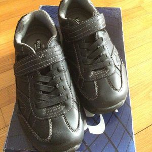 Black leather boys' runners with velcro strap and elasticized laces. Perfect for uniform wear. Comfortable with foam inner soles. Never worn. New with box. Gray stitching and inner lining. Black exterior including outer soles.