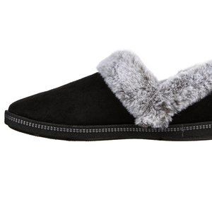 This casual comfort slipper features a soft woven fabric upper with a cozy warm lining, faux-fur trim, and a cushioned Skechers Memory Foam™ comfort footbed.