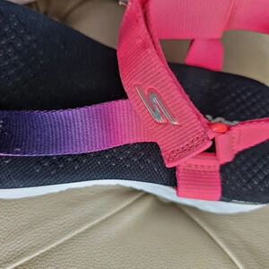 Comfort and sporty colorful style harmonize in the Skechers On the GO 400 - Jazzy sandal. Sporty web fabric upper in a sporty casual comfort strappy river style sandal with Goga Max® footbed and Skechers GOrun 400 design sole.