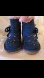 Adorable faux navy suede boots, with a pink and white knit back, and wrap tied with a bow.