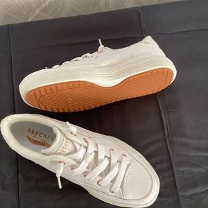 White with gold accents, these Skechers have arch fit and cute gold accents. They are new without tags and are size 7.