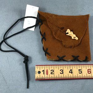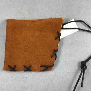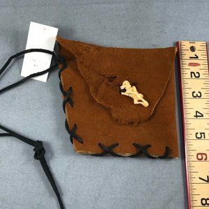 Hand-made leather pouch can be used as a dice bag or herb or crystal bundle. Skeleton figure acts as button fastener. About 5 1/2" square.