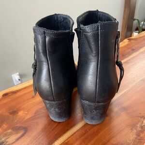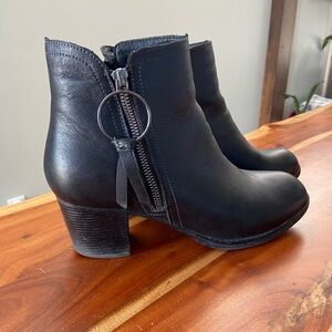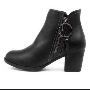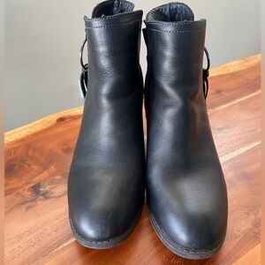 From sketchers, size 10, women’s, genuine, leather upper chunky block, heel side, zip memory, foam, ankle bootie