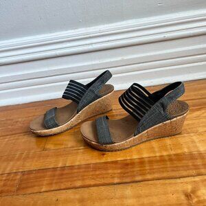 Sketchers platform wedge sandals with grey elasticated strap and cork platform. So so comfortable and totally walkable :)