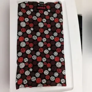 Head buff. No sign of wear. Black background with white, red, brown stylized snowflakes