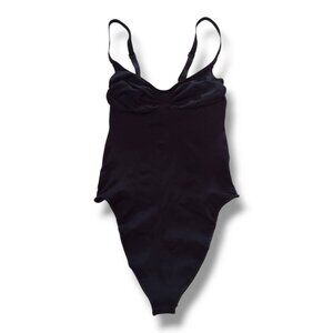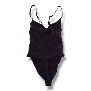 "The internet’s favorite sculpting bodysuit, updated for an even better fit. This waist-cinching style enhances your shape with extra compression at the core and waist and has perfectly placed style lines that flatter your bust. Features adjustable straps, a wide crotch for added coverage, and an open gusset with snap closure. Fits true to size." Scoop front neckline, Front Pique stitching along center front and sides for support and bust definition, Adjustable straps, Strong compression along tummy, core and waist, Wide gusset for added coverage, Thong back, 100% Cotton gusset with snap closure Skims Seamless Sculpt Thong Bodysuit Size: Large Color: Onyx