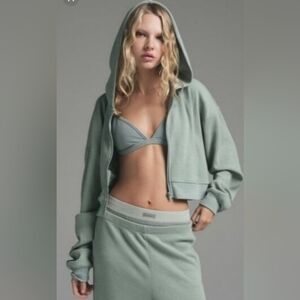 Skims Zip Up Cropped Brushed Waffle Casual Hoodie In Mineral Green Size 2X