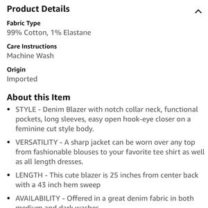 • STYLE - Denim Blazer with notch collar neck, functional pockets, long sleeves, easy open hook-eye closer on a feminine cut style body.