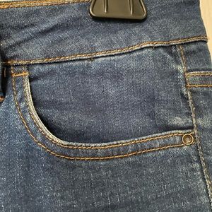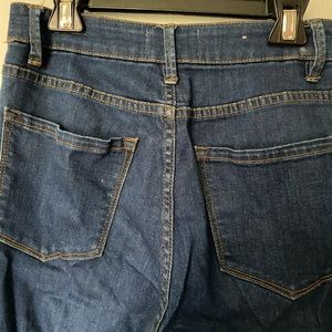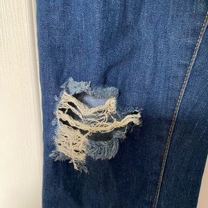 Dark blue skinny jeans (more stretchy like a begging). Rips on both knees. High rise.