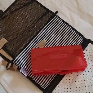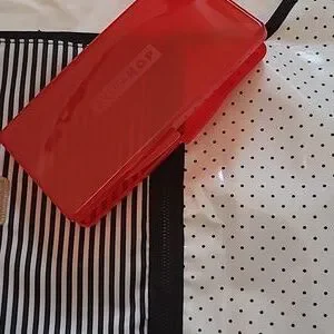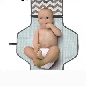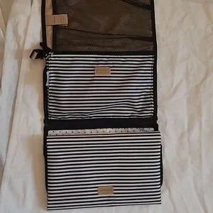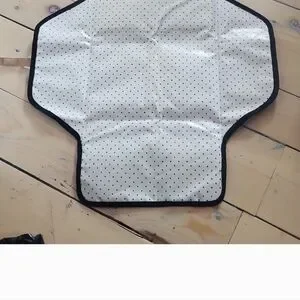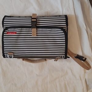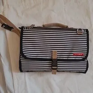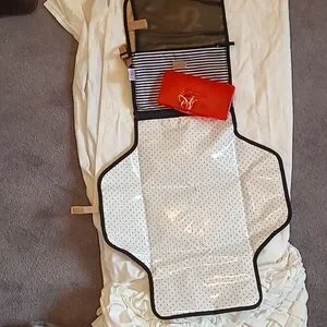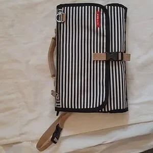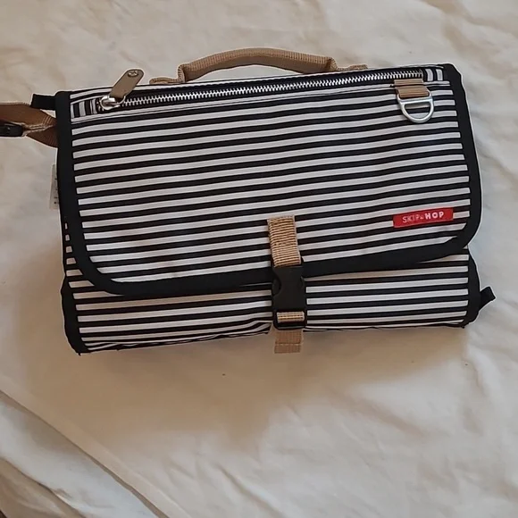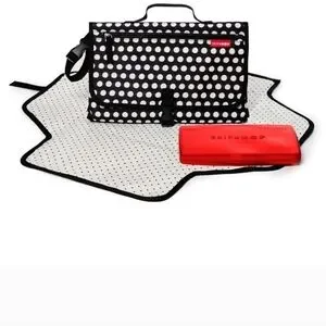 they've thought of it all! Has a red caw for wipes, a spot for diapers, can attach to your wrist, your stroller, you car seat, your diaper bag! classic stripe with polka dot pad, easily wiped clean if any spills happen, water resistant.