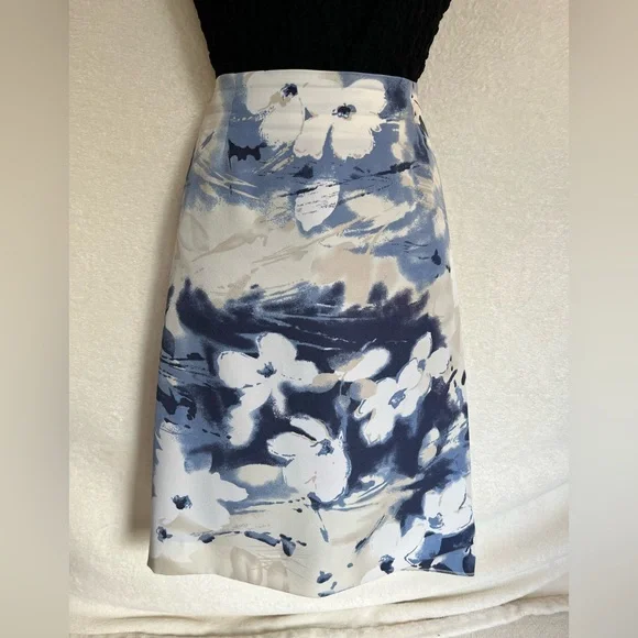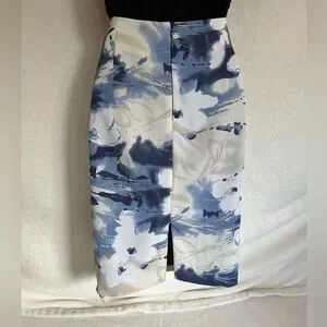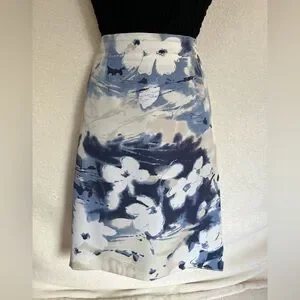 This knee-length skirt has an abstract flower pattern. 22” long.