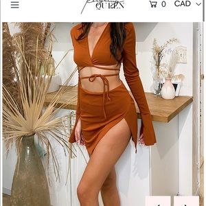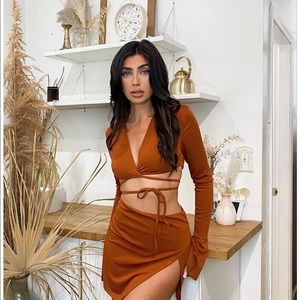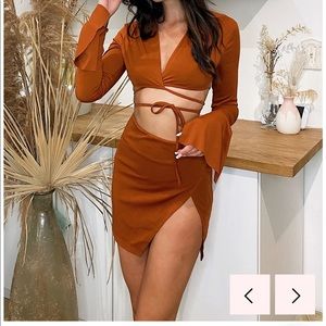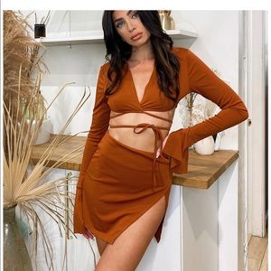 Slit mini skirt and long sleeve top with flared ends on sleeve