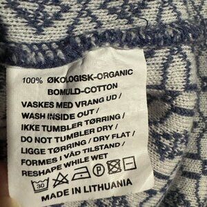 Skovhuus Organic Cotton Blue White Geometric Knit Zip Cardigan Sweater in a women’s size Medium. This cozy and stylish zip-up cardigan is crafted from 100% organic cotton and features a beautiful blue and white geometric knit pattern. Designed in a slightly relaxed fit, it’s perfect for layering over tees or turtlenecks during cooler weather.